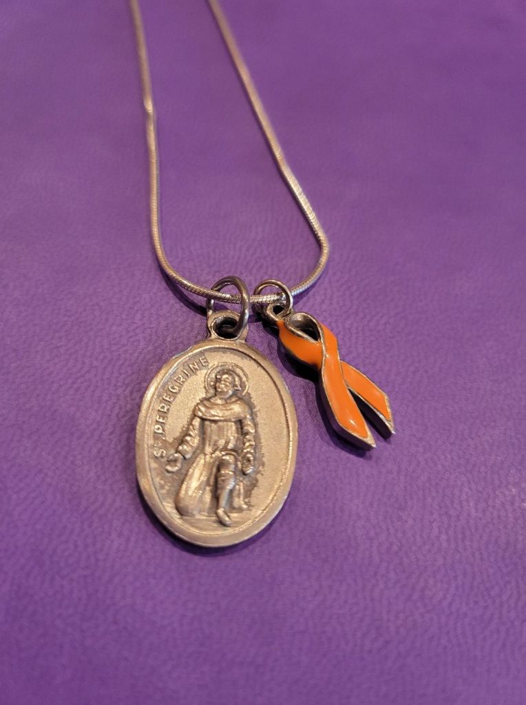I knew Jon was now in Heaven, not only watching over his family but watching over me as well. When I wear my St. Peregrine medal, I smile and think of Jon as well. I had the ring welded shut so that it would never accidentally fall off my necklace and years later added the orange ribbon – leukemia’s ribbon color to my necklace.